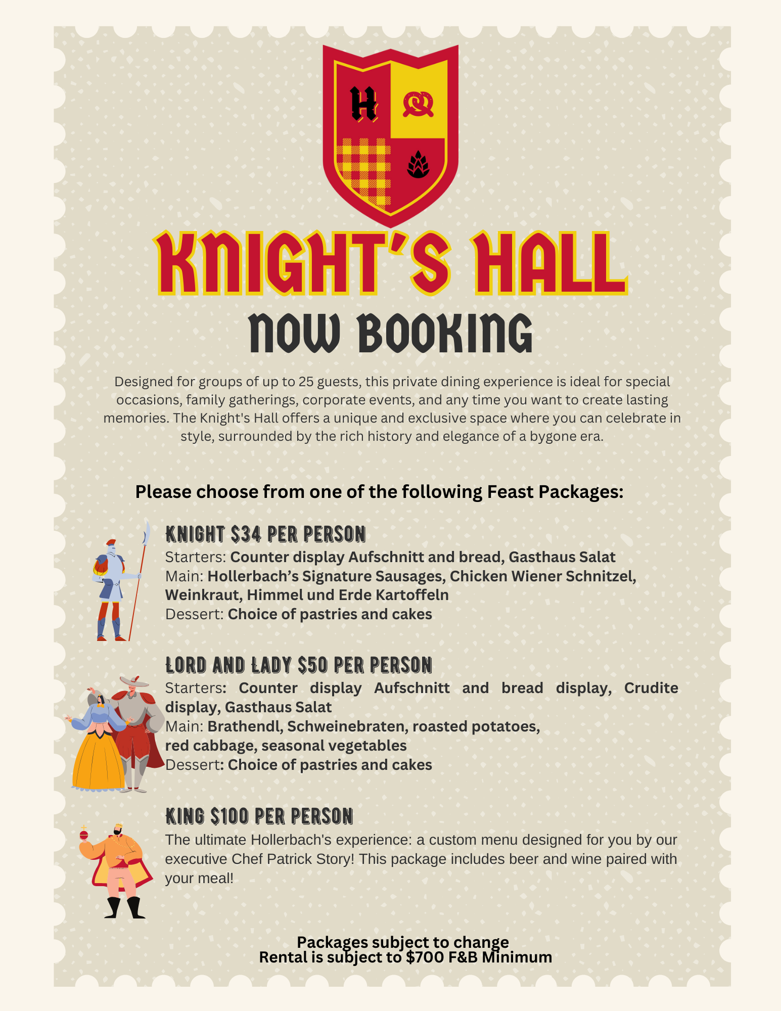 Note: Knights Hall experiences follow a separate pricing structure with more elevated, plated or family-style service options.